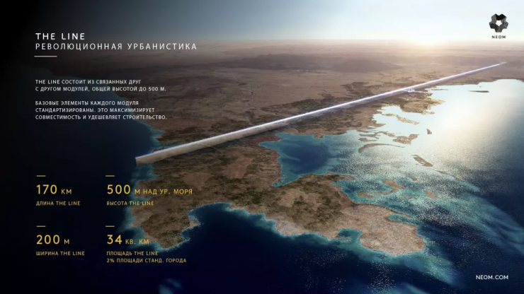 Напомним, что в 2023 году Саудовская Аравия объявила о строительстве самого футуристического города планеты — The Line. Мегаполис представляет собой рукотворную беспрерывную линию из зеркал длиною 170 км посреди пустыни. При этом ширина города составляет 200 м., а высота 500 метров. The Line должен был полностью функционировать на возобновляемых источниках энергии. Несмотря на тот факт, что «зеркальный мегаполис» находится в регионе, где летом средняя температура составляет 38–45 °C, для жителей и гостей города планировалось обеспечить круглогодичный умеренный микроклимат с естественной вентиляцией.