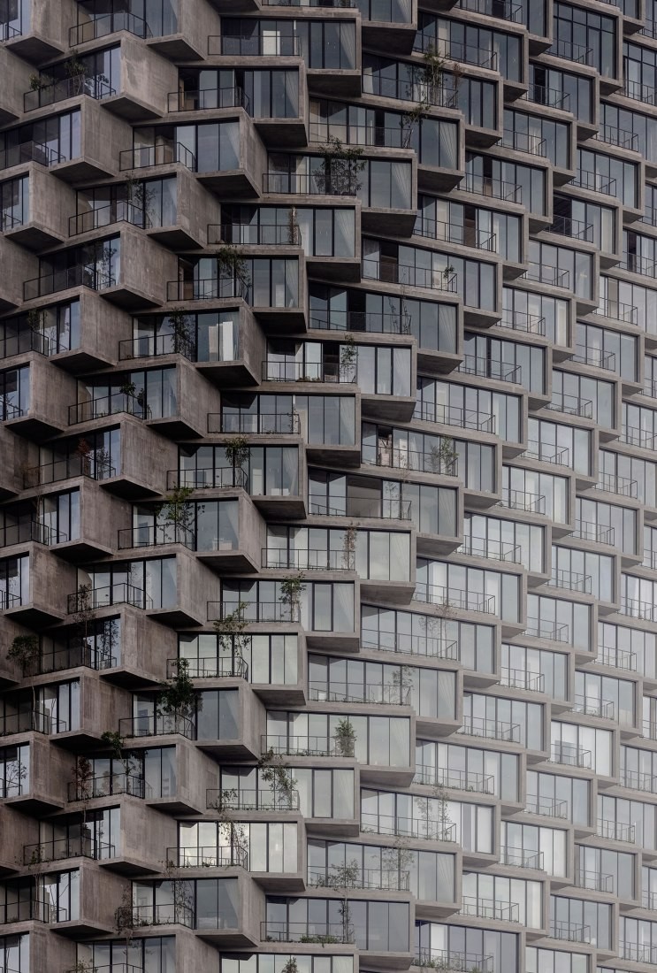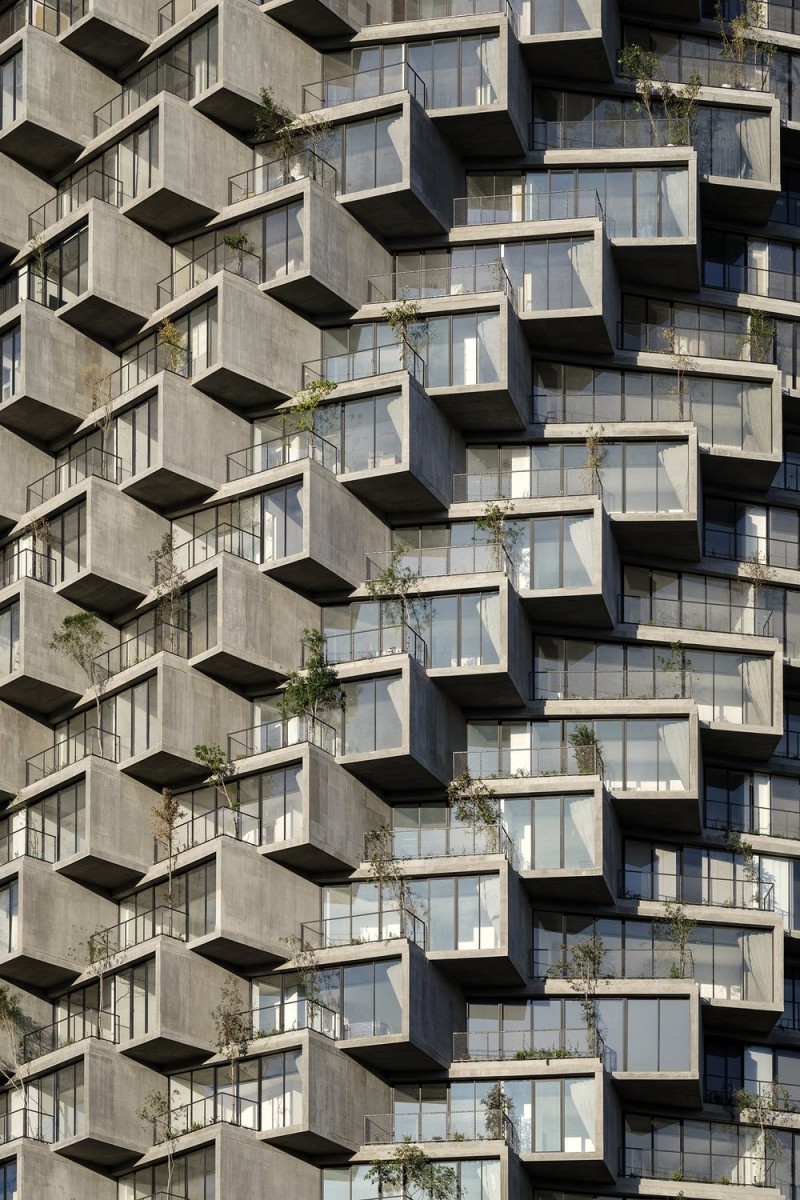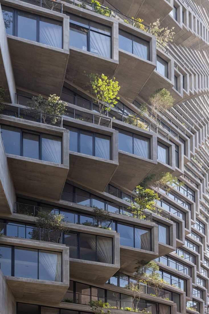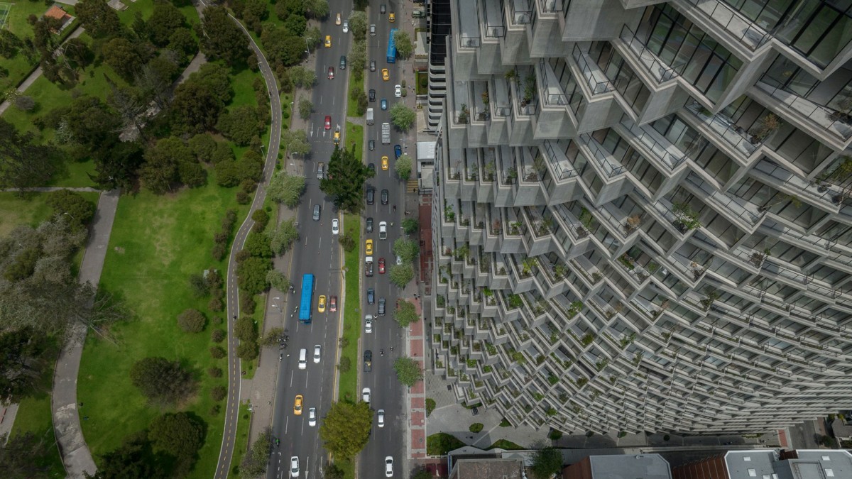 Брутальный фасад, сложенный из бетонных балконов в виде коробов, оживляет зеленая растительность, обильно покрывающая каждый из них. Витражное остекление придает конструкции балансирующую легкость. Из окон апартаментов открывается панорамный вид на город и вулкан Пичинча.