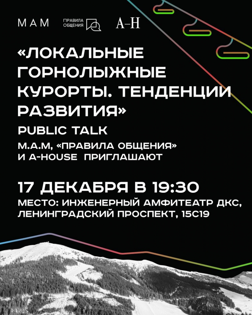 Еще можно успеть — завтра, 17 декабря в 19:30 пройдет открытый лекторий, посвященный теме «Локальные горнолыжные курорты. Тенденции развития» х М.А.М., организаторы события М.А.М + «Правила общения» + A-HOUSE.