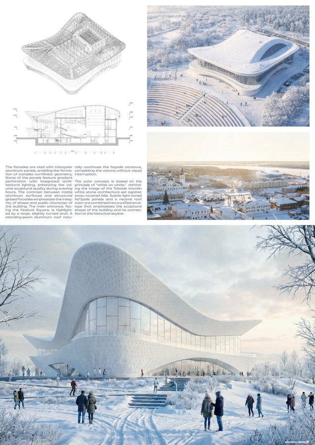 Цветовое решение строится на принципе «белое на белом», переосмысляя образ белокаменного кремля на фоне заснеженных холмов. Нежные оттенки фасадов и нейтральный тон кровли сливаются в целостную композицию, определяя общую архитектуру здания через диалог с историческим пейзажем. Открытие нового концертного зала в Тобольске запланировано летом 2027 года.