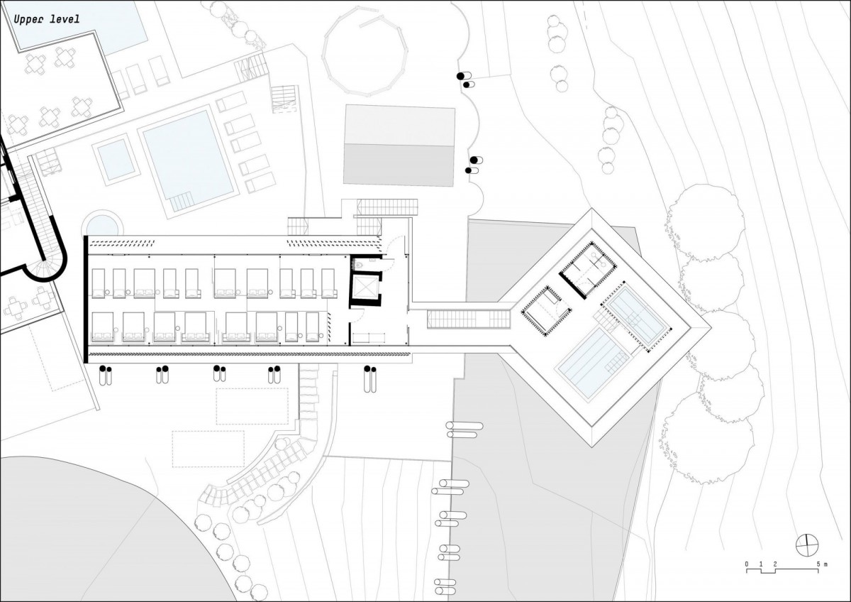 Посетители попадают в спа-зону по подвесному мосту, где на двух уровнях разместились разнообразные релакс-пространства. Благодаря двускатным крышам, находясь на нижнем уровне, гость видит горизонт перевернутым на 180°.